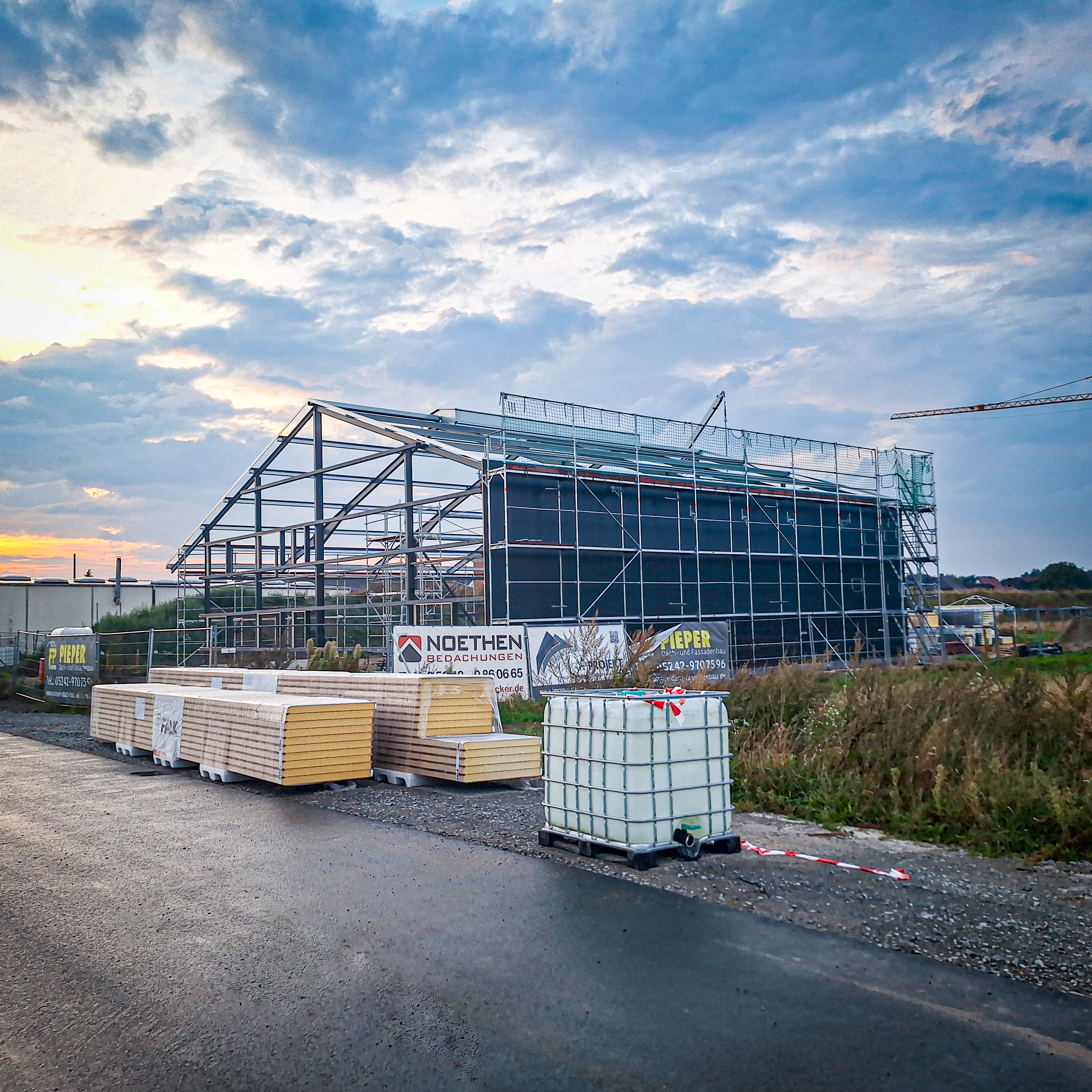 Die Arbeiten an der Außenhülle des Gebäudes sind weit fortgeschritten: Sowohl das Dach als auch die Wände unserer neuen Lagerhalle sind vollständig installiert. Die montierte Dachkonstruktion sowie die Fassadenelemente verleihen dem Gebäude bereits jetzt ein modernes und robustes Erscheinungsbild. Auch die vorbereitenden Maßnahmen für die weiteren Bauabschnitte, wie die Installation der Photovoltaikanlage, werden demnächst folgen.